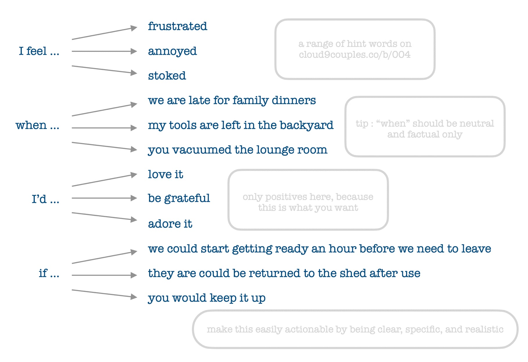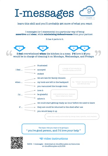 I-messages (or I-statements) is a particular way of being assertive and clear, while minimising defensiveness from your partner.